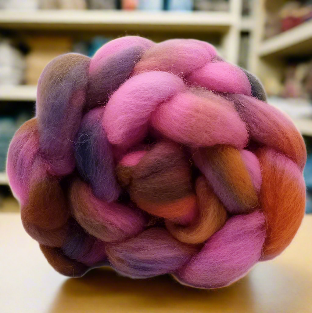 Let your creativity run wild with this magical, vibrant hand dyed natural Shetland combed wool top, swirling with electric pinks, dusky violets, golden moss, and hints of woodland shadow. The colors dance like a fairy parade, bold & mischievous. Shetland wool is known for its springy loft, versatility, and the soft yet rustic hand that many spinners, felters, and crafters adore.